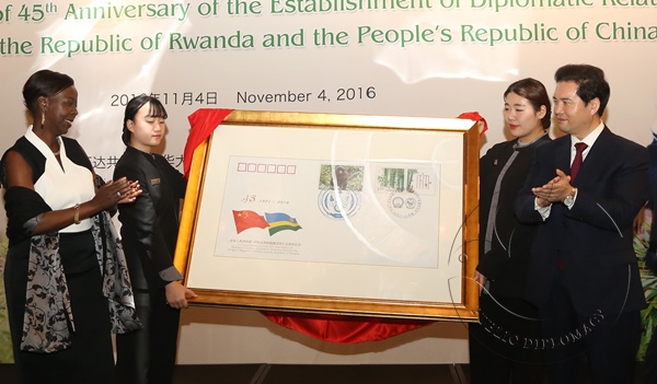 致辞结束后,中国全国政协副主席王正伟与卢旺达外交与合作部部长路易丝·穆希基瓦博共同切下庆祝蛋糕,并为中卢建交45周年首日封揭幕。(文/公共外交网记者 文杰)