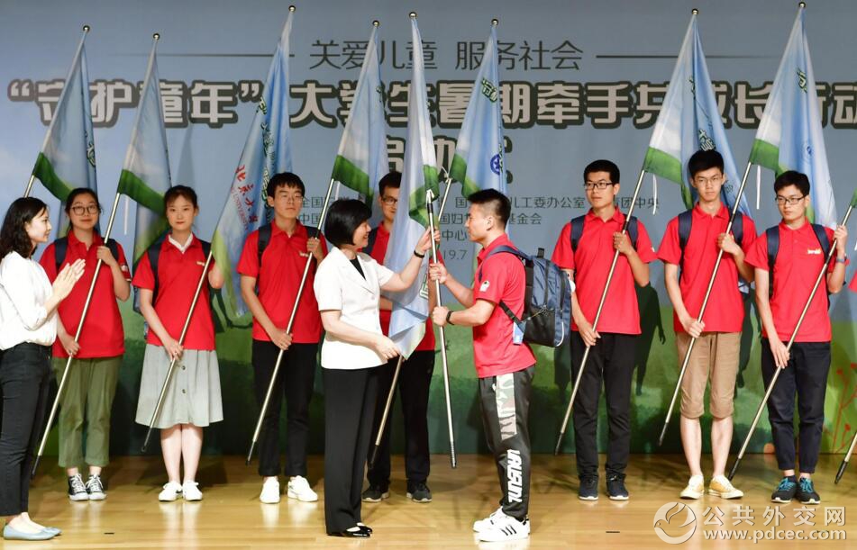 “牵手留守儿童,结伴困境儿童,辅导家庭作业,举办家庭教育培训……”“关爱儿童 服务社会——‘守护童年’大学生暑期牵手共成长行动”启动式在中国人民大学举行。全国妇联主席沈跃跃宣布活动启动并为高校志愿者代表授旗,她勉励志愿者们牢记习近平总书记对广大青年学子提出的殷切期望,积极参与社会实践,锤炼品行情操,增强关爱儿童、服务社会、报效国家的责任感和使命感,在火热的实践中书写青春之歌。全国妇联副主席、国务院妇女儿童工作委员会副主任黄晓薇,教育部副部长郑富芝出席并致辞。民政部副部长高晓兵主持。
