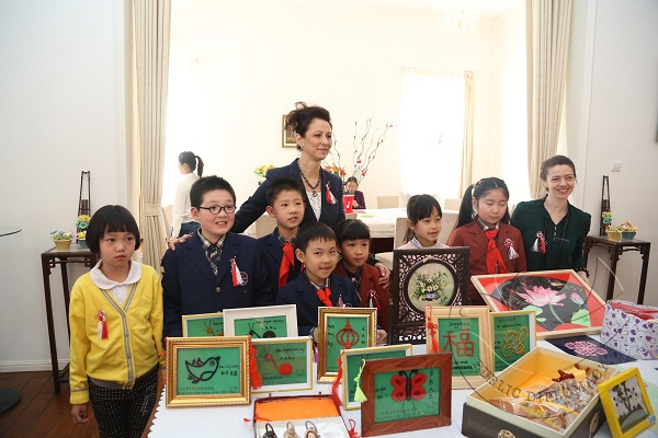 来自北京的小学生向大使夫人介绍自己手工制作的小礼物