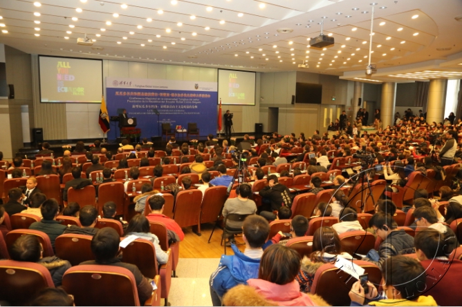 【公共外交网讯】应国家主席习近平邀请,厄瓜多尔总统拉斐尔·科雷亚·德尔加多于1月5日至9日对中国进行国事访问,并出席中国-拉共体论坛首届部长级会议。1月7日,科雷亚总统在清华大学发表题为“新型厄瓜多尔经济:证明新自由主义是歧途的典范”的演讲。演讲会由清华大学校长陈吉宁主持,厄瓜多尔驻中国大使何塞﹒博尔哈、外交部长里卡多·帕蒂尼奥、中外学者、企业界代表、清华大学在校师生等500余人与会,公共外交中心副会长曲真也应邀出席了此次演讲会。