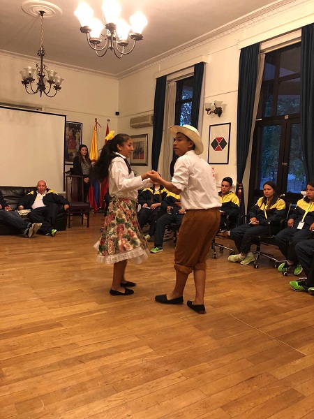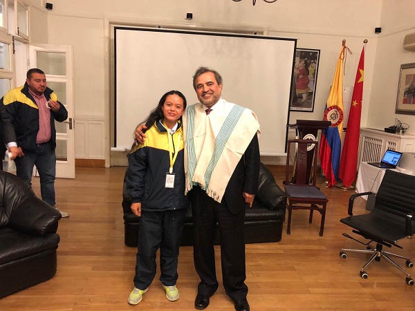 活动中,哥伦比亚青年与来宾共同分享他们参加本次活动的感受和初到中国的所见所闻。他们有的对中国的筷子简单但不平凡的使用赞不绝口;有的希望今后有机会到中国寻求学习、工作机会;还有的立志投身乒乓球事业、成为出色的乒乓球运动员……同学们赞叹,在中国这片美丽的土地上学到的东西会为自己的一生留下印记。畅谈之余,两名学生跳起了哥伦比亚传统的霍隆珀(joropo)舞,和着哥伦比亚音乐山泉般清澈的旋律,少年用特殊的舞鞋踏出铿锵明亮的节奏,一股清新淳朴的哥伦比亚民族风顿时展现在大家面前,赢得现场阵阵掌声。会谈结束时,学生代表向鲁埃达大使赠送了哥伦比亚的传统披肩。