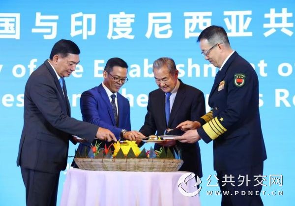 招待会上,四位部长按照印尼传统习俗,共同切开象征着感恩、团结与和谐的黄饭塔。苏吉约诺和王毅共同为印尼发行的庆祝两国建交75周年纪念邮票和中国发行的纪念封揭幕。