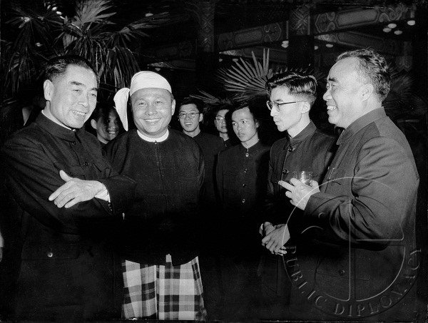 1956年10月25日朱德副主席(右一)、周总理(左一)和吴努主席(左二)在周总理举办的酒会上。右二为程瑞声
