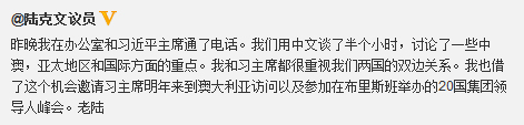 让我觉得难能可贵的是,这位“老陆”重任总理一职后,竟对他近50万的微博粉丝“不离不弃”,继续编织“老陆”围脖。从4月27日就职总理到5月9日,“老陆”发帖6条,其中有内阁成员就职礼、与习主席通话、会见中国驻澳大使、出席印尼与澳大利亚对话会、观看澳英橄榄球赛,每个帖子都是图文并茂。让他的粉丝们生动地了解和分享他的工作和生活。