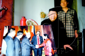 苏禄王第十八代安金田与儿子安砚春展示多年前在菲律宾受到阿罗约接见时的合影。