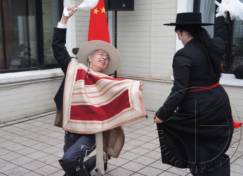 作为中智两国友好关系的体现,施密特大使与陆军武官奥斯卡为中国人民解放军薛州堂大校授勋,以表彰他为中智友谊做出的贡献。国庆仪式的最后,施密特大使以智利传统舞蹈奎卡(CUENCA)和南美风味美食款待众人。(文/公共外交网记者黄瑜蓉)