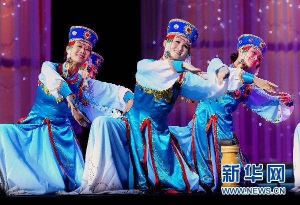 7月12日,来自锡林郭勒盟民族歌舞剧团的演员在表演《捣茶舞》。当日,第八届中国内蒙古草原文化节舞蹈精品展演在内蒙古自治区首府呼和浩特举行。来自内蒙古大学艺术学院、内蒙古民族歌舞剧院、内蒙古自治区直属乌兰牧骑艺术团以及中央民族大学舞蹈学院等团体的舞蹈演员表演了《鄂尔多斯舞》《敖包相会》《顶顶碗舞》等经典民族舞蹈,让观众领略到草原民族精彩绝伦的舞蹈和博大精深的文化。
