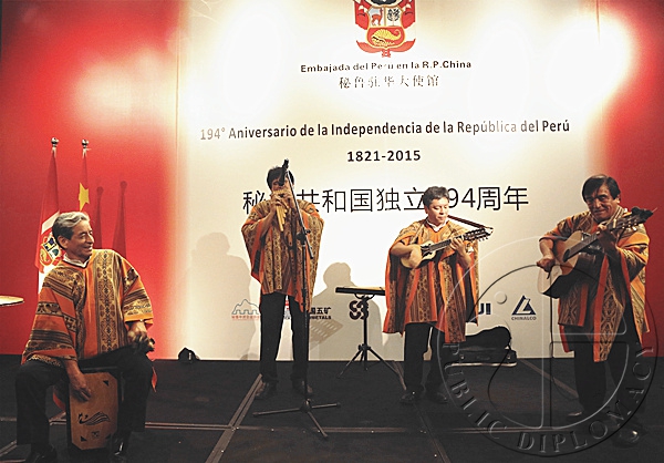 招待会现场,来自秘鲁的乐手用排箫、五弦琴等秘鲁乐器演奏中国民乐,以悠扬的乐曲诠释中秘两国的文化交流与融合。