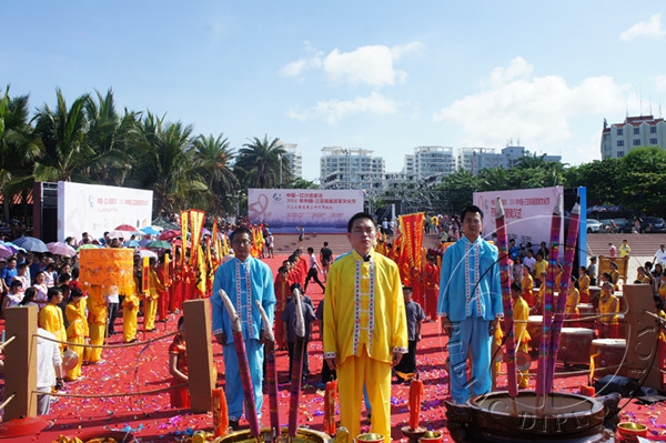 2日上午9时,大东海广场祭旗猎猎、船鼓震天,一场盛大的祭海仪式在庄严的音乐声中正式开始,祭台上,主祭人庄严地面对大海宣读祭文;祭台下,三亚市民、游客、渔民皆聚精会神,共同祈祷。