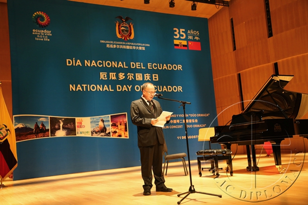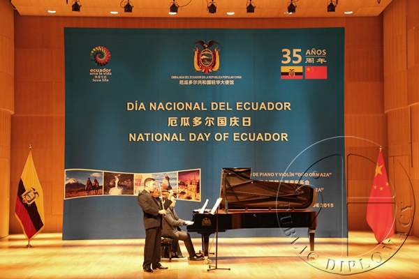 【公共外交网讯】值厄瓜多尔共和国206周年国庆之际,8月11日晚,厄瓜多尔驻华使馆在北京国家图书馆艺术中心举办钢琴小提琴二重奏音乐会。厄瓜多尔驻华大使何塞·博尔哈,拉美及加勒比国家驻华使节,中国前驻拉美外交官及各界友好人士等近八百人出席。