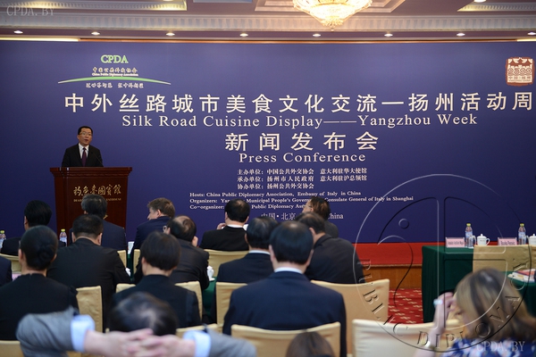 由中国公共外交协会、意大利驻华大使馆主办,扬州市人民政府、意大利驻沪总领馆承办的首届“中外丝路城市美食文化交流活动-扬州活动周”日前在北京举办新闻发布会。中国公共外交协会副会长马振岗、意大利驻华大使馆技术与工业改革参赞饶塞佩、扬州市市长朱民阳以及各国驻华使节等出席。此次活动周将于9月11—15日在扬州举办,旨在响应国家“一带一路”战略,抓住发展机遇,利用马可·波罗与扬州的渊源,通过美食文化媒介,发挥公共外交的独特优势,加强与意大利等丝路国家及城市的多元化交流与合作,加深对沿线国家特色的了解,促进沿线地带的经济发展,为“一带一路”沿线国家的互利共赢合作打基础。