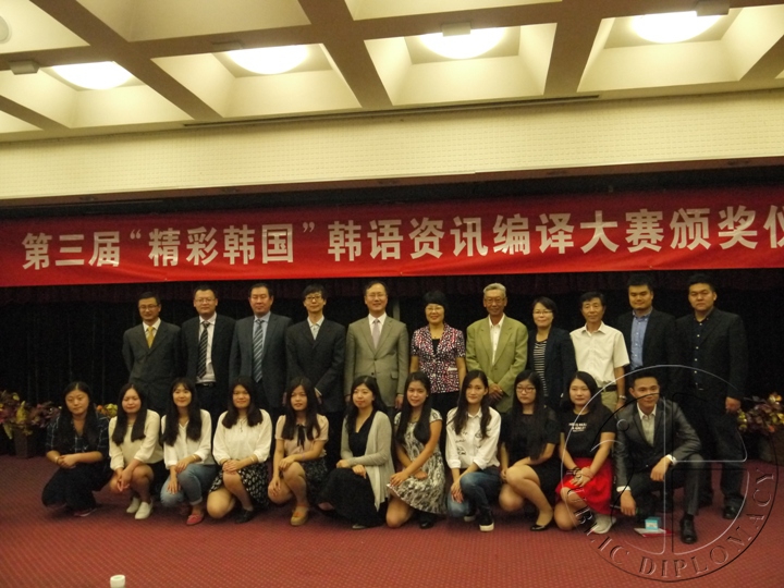 9月16日下午,第三届“精彩韩国”韩语资讯编译大赛颁奖仪式在对外经贸大学举行。此次大赛由环球网与韩国驻华使馆共同举办,来自60所大学的韩语学生及韩语爱好者共计约500人参加角逐,最终共有30名选手胜出。本次大赛是国内目前影响力最大的韩语编译比赛,参赛选手通过编译韩国主流媒体信息向中国网友传播了韩国文化,而且还推动了“韩流”和“汉风”在两国的辉映。
