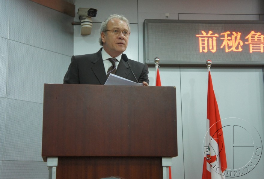 秘鲁驻华大使贡萨洛•古铁雷斯•雷内尔在发布会上致辞