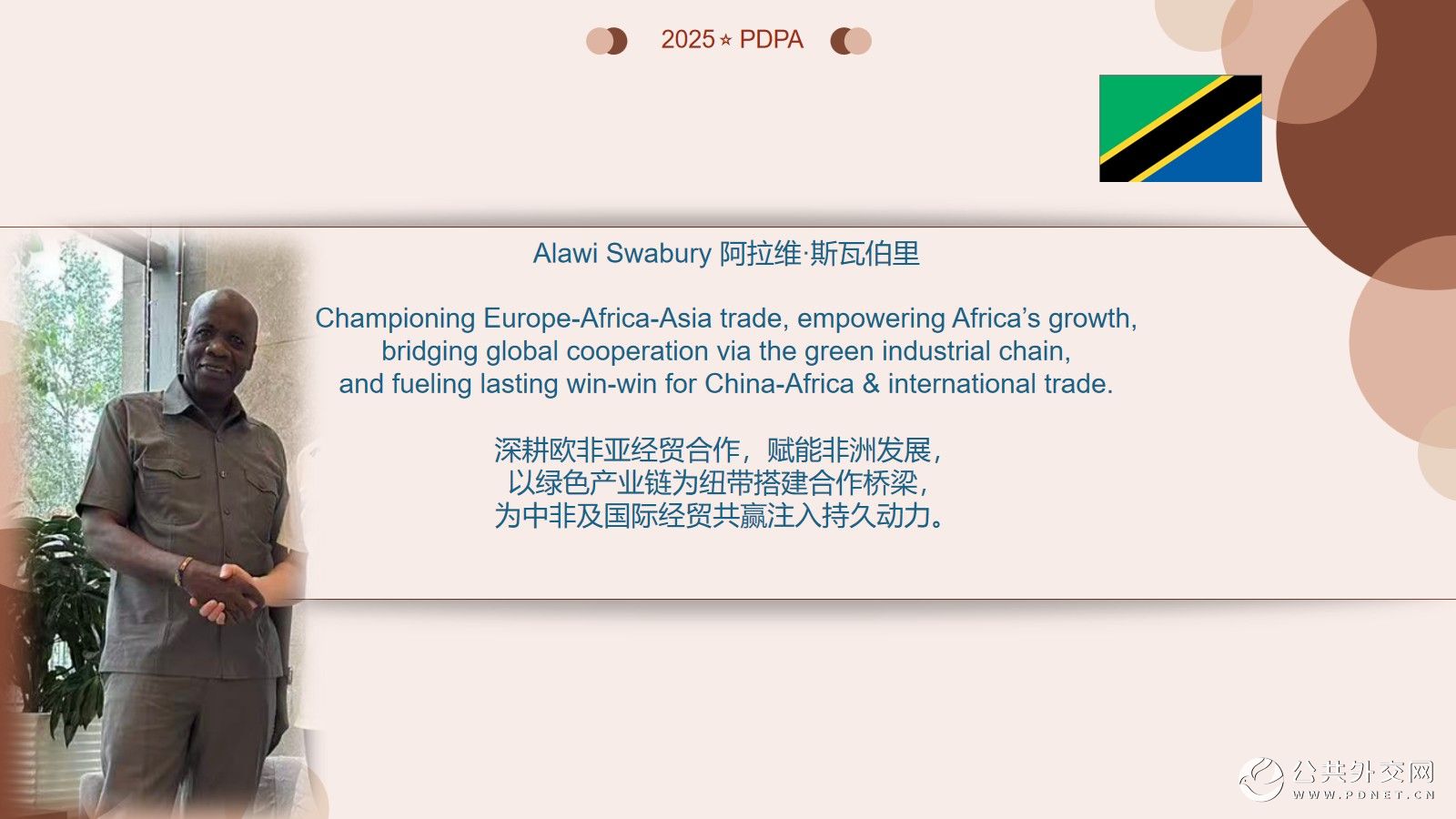 阿拉维·斯瓦伯里(Alawi Swabury )来自坦桑尼亚,他专注欧非亚经贸合作,赋能非洲发展,以绿色产业链为纽带搭建合作桥梁,为中非及国际经贸共赢注入持久动力。喀麦隆驻华使馆副武官艾图阿先生和中国华能国际部副主任王文娟女士为阿拉维·斯瓦伯里(Alawi Swabury )颁奖,布隆迪驻华使馆副馆长、一等领事阿尔弗雷德代领并代为宣读获奖感言。