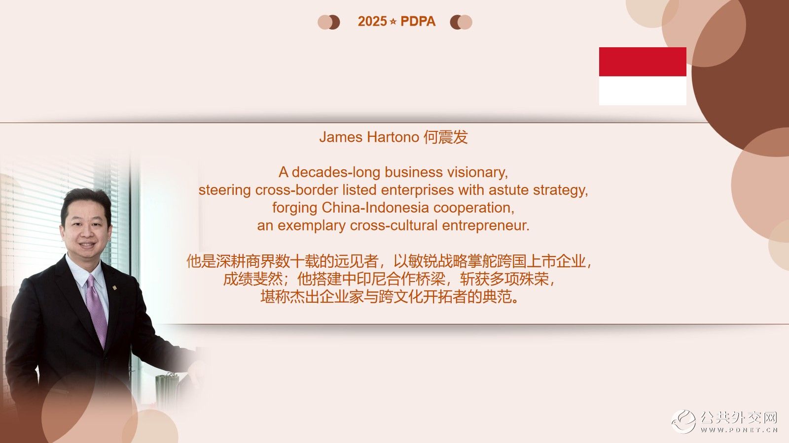 An Indonesian national with decades of experience in the business community, James Hartono has steered cross-border listed enterprises with a keen strategy, built a solid bridge for China-Indonesia cooperation, and become a benchmark for outstanding entrepreneurs and cross-cultural pioneers. H.E. Mr. Djauhari Oratmangun, Ambassador of the Republic of Indonesia, and Mr. LIU Chunyang, Editor-in-Chief of the Public Diplomacy Network, Deputy Director of the International Exchange Working Committee of China Association of Trade in Services, and Chairman of the Organizing Committee of the Public Diplomacy Person Award presented the award to Mr. James Hartono (He Zhenfa).