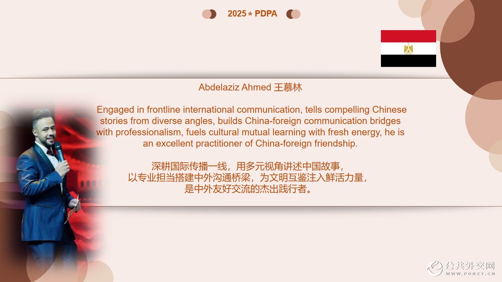 公共外交年度人物评奖活动,旨在以民间视角甄选并表彰对促进人民友谊与合作做出积极贡献的友好人士。活动由公共外交网发起主办,由驻华使馆和国际机构共同推荐候选人并评选得奖人,由中国服务贸易协会国际交流工作委员会联合承办。此项活动坚守“以民间视角甄选榜样,以实际行动促进合作”的初心,表彰那些长期深耕国际交流一线,为推动不同国家和民族间的友谊合作、文化交融、互利共赢作出积极贡献的友好人士。2025年度最终评选出10位获奖人,他们来自印尼、塞尔维亚、埃及、比利时/法国、阿根廷、俄罗斯、委内瑞拉、荷兰、坦桑尼亚、波黑等多个国家,涵盖商业、学术、文化、科研、传媒、经贸等多个领域,用各自的坚守与担当,书写了中外友好交流的动人篇章。