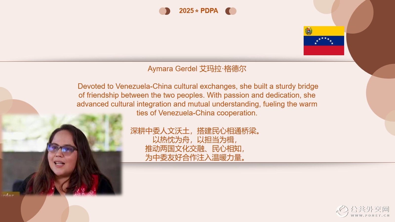 委内瑞拉籍获奖者艾玛拉·格德尔(Aymara Gerdel)以中委人文交流为沃土,以热忱与担当推动两国文化交融、民心相知,为中委友好合作注入温暖力量。委内瑞拉驻华使馆公使衔参赞玛利亚·多斯·拉莫斯女士和中国湖南麻阳驻京联络处曾明先生为艾玛拉·格德尔(Aymara Gerdel)颁奖。