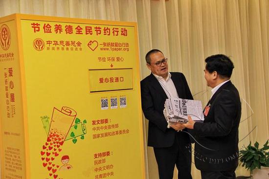 “一张纸献爱心行动”的发起人、中华慈善总会新闻界慈善促进会执行会长徐镱轩说:今年是“爱心屋”第七次走进全国两会代表、委员住地。期间,共有260名人大代表把废旧报纸投入“爱心屋” ,200多名政协委员签名寄语支持,七年来累计有200多名政协委员联名提案。全国政协委员、中华慈善总会副会长李宏塔今年已经是第五次在两会提案“关于在全国进一步大力推广“一张纸献爱心”行动”。