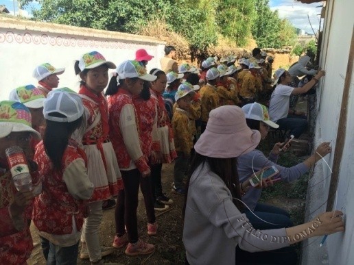此次在探访达祖小学之前,立邦了解到当地村民的情况,希望可以给这个美丽安静的村落做更多的事情,不仅改善学生的学习环境,更希望能为“村庄上色”,美化孩子们生活的家园,用艺术与爱陪伴他们的成长。立邦和上大美院的志愿者一起,不仅详细分析达祖村落的建筑特点、文化特色和民族信仰,还特别向达祖小学校长及东巴文老师请教,精心设计了以民族图腾作为边框,以东巴文字做填充与诠释的墙绘方案,为古老的村庄重新上色。
