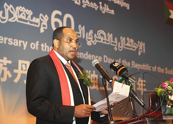 【公共外交网讯】2016年1月13日晚,为庆祝苏丹共和国独立60周年,苏丹驻华使馆在北京千禧大酒店朝阳厅举办庆祝招待会。苏丹驻华大使欧玛尔·伊萨·艾哈迈德、中国全国政协副主席陈元、苏丹运输和路桥部长马卡维·穆罕默德·阿瓦德、苏丹财政部国务部长阿卜杜勒·拉赫曼·达拉尔等三百余人出席招待会。