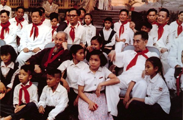 1960年5月,周恩来访问越南时,和胡志明主席同少年儿童在一起。