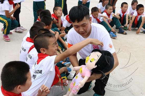 “拉勾勾儿”公益和教练团队针对低年级的学生,设计了一套预防外界侵害(包含性侵害),各种意外灾害自救的互动游戏课程,领队告诉我们,因为留守儿童是未成年意外事故和人为侵害的最大主体,这套课程就是为了让他们在游戏中学会自我保护,紧急自救,将伤害的程度降到最低!