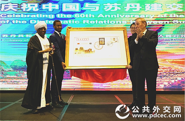 苏丹驻华大使艾哈迈德·沙维尔与全国人大常委会副委员长艾力更·依明巴海为中国-苏丹建交60周年纪念封揭幕