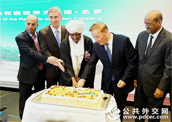 招待会上,艾哈迈德大使与全国人大常委会副委员长艾力更·依明巴海为中国-苏丹建交60周年纪念封揭幕,并共同切下庆祝蛋糕,祝愿中苏两国关系更加进步、繁荣。