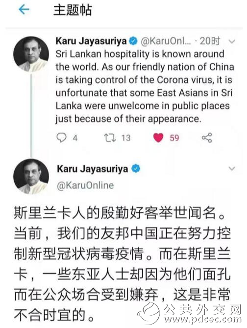 而针对此前个别不友好的现象,斯里兰卡议长卡鲁还在社交媒体上发文:
