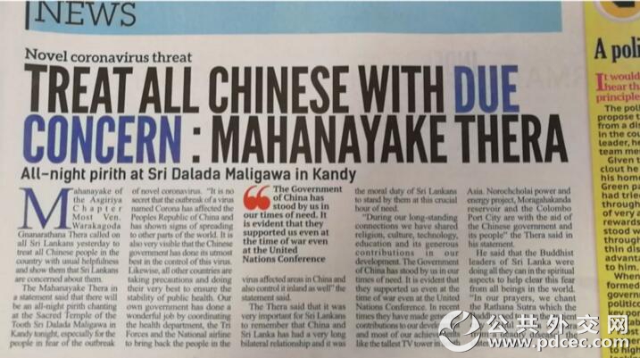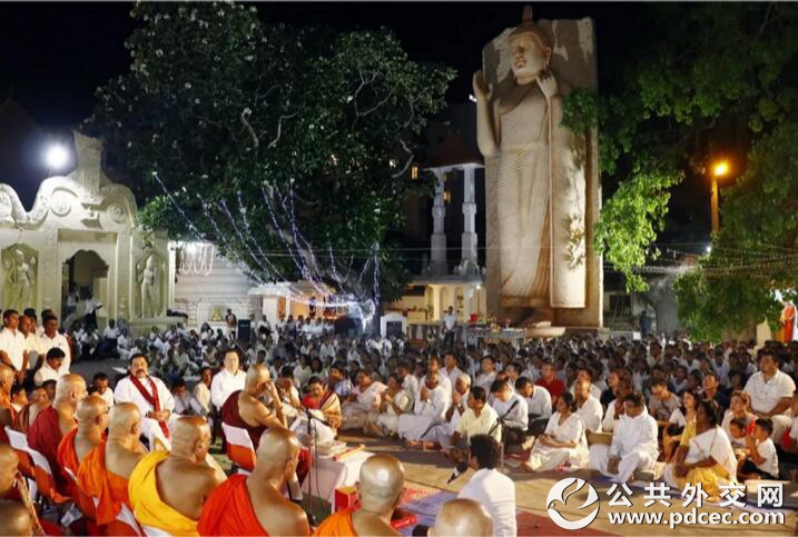 斯里兰卡总理马欣达·拉贾帕克萨结束了一整天的议会和内阁会议后即匆匆赶来,率领多名内阁部长、议员和自发前来的近千名各界民众,根据宗教仪轨和当地习俗,素衣裸足、恭敬虔诚,共同为中国人民抗击新型冠状病毒疫情诵经、祈福。
