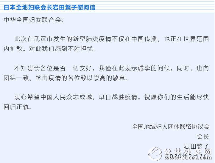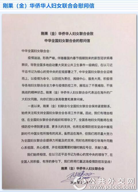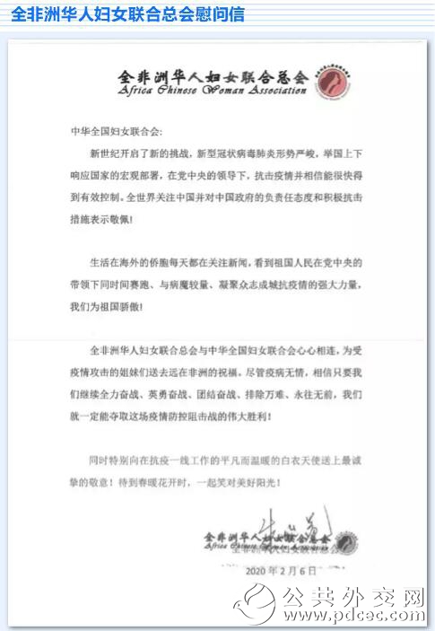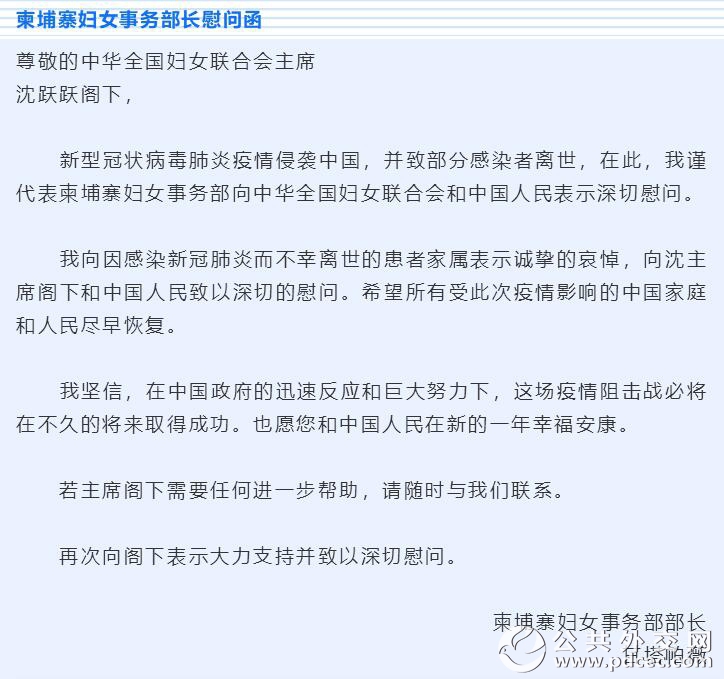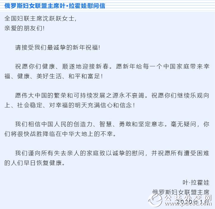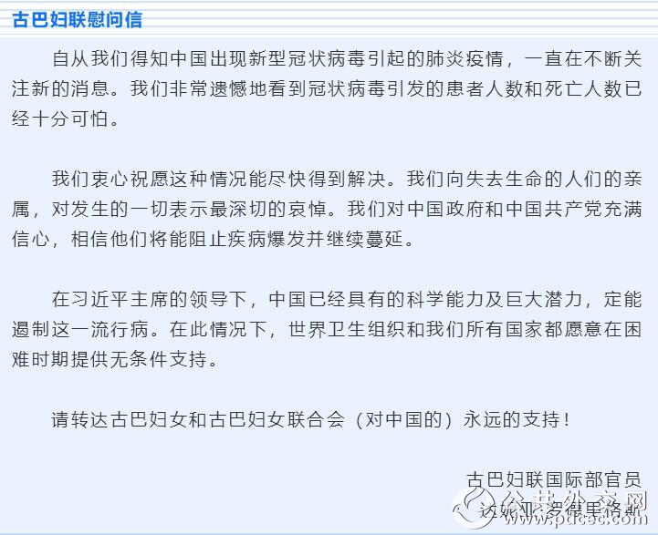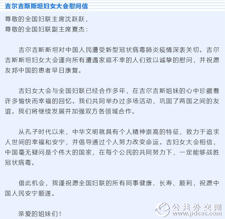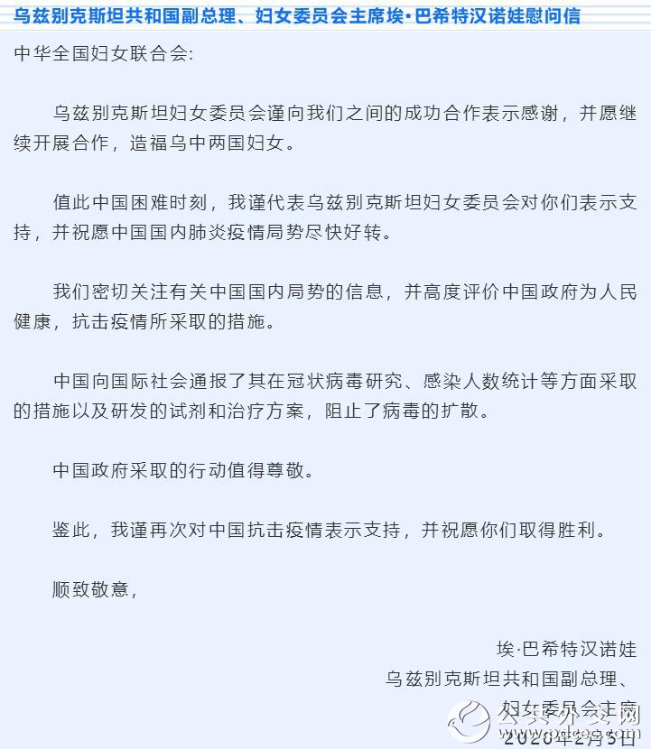中国爆发新型冠状病毒肺炎疫情以来,外国妇女组织和机构、国际组织和海外华人华侨妇女组织纷纷发来慰问信并积极筹集钱款和物资,为中国加油、为武汉助力。截至2月6日晚,联合国妇女署、俄罗斯妇女联盟、吉尔吉斯斯坦妇女大会、乌兹别克斯坦妇女委员会、古巴妇联、柬埔寨妇女事务部、日本全地妇联、日本创价学会、巴林王国驻华使馆、刚果(布)驻华使馆、瓦努阿图驻华使馆11个妇女组织和相关机构发来慰问信。
