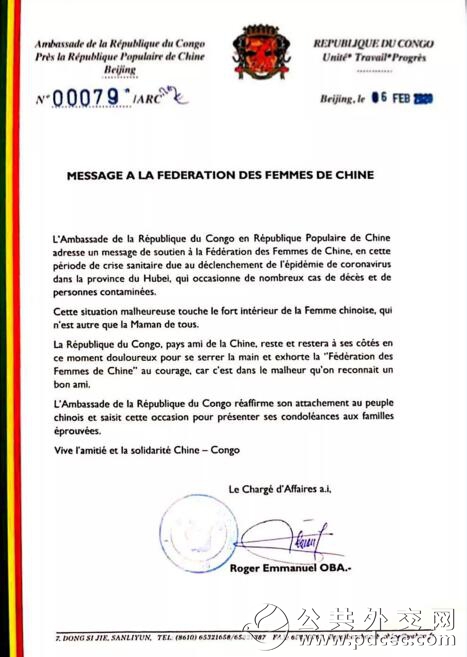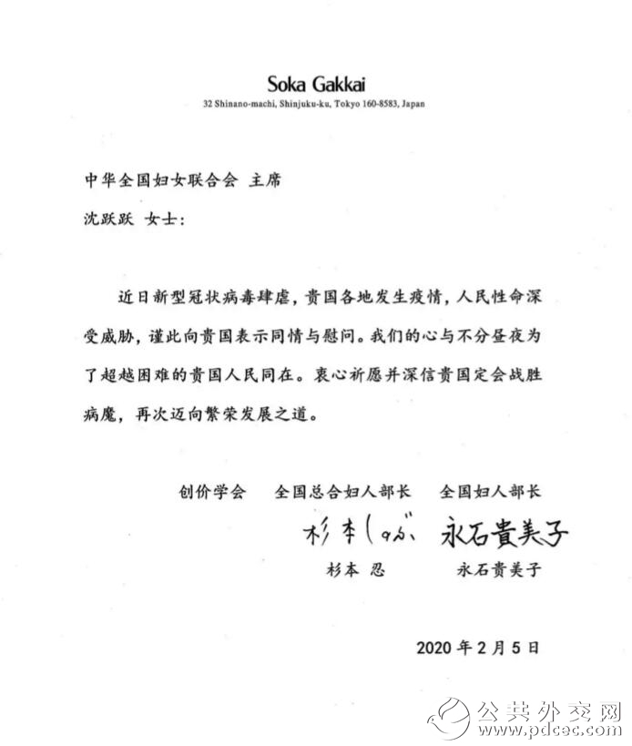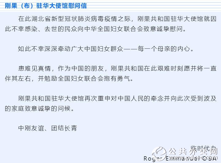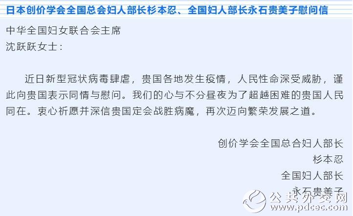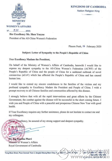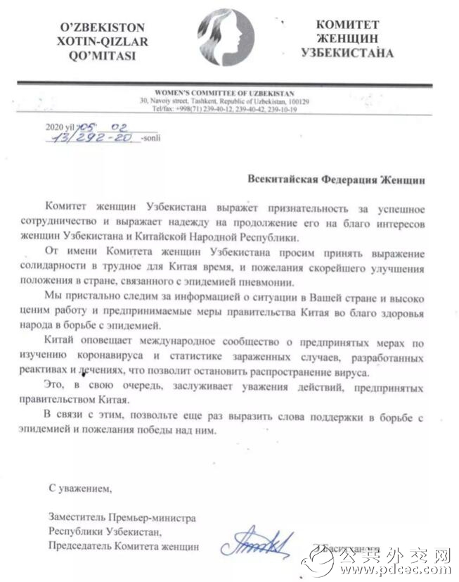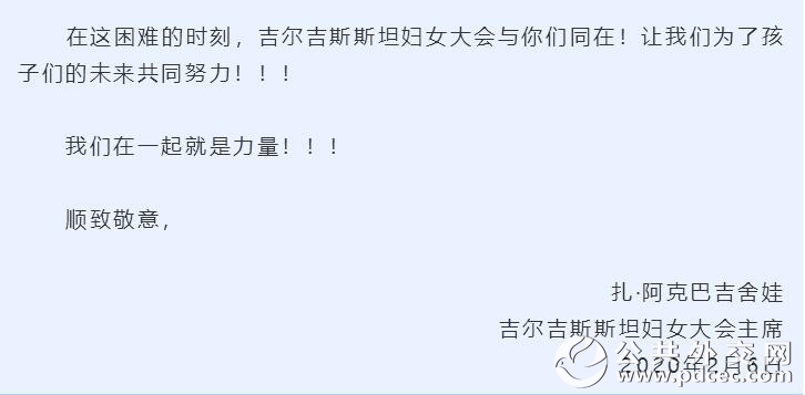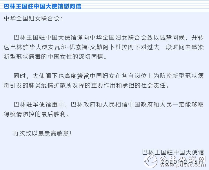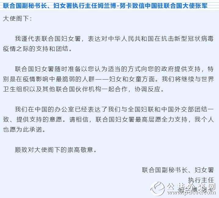 中国爆发新型冠状病毒肺炎疫情以来,外国妇女组织和机构、国际组织和海外华人华侨妇女组织纷纷发来慰问信并积极筹集钱款和物资,为中国加油、为武汉助力。截至2月6日晚,联合国妇女署、俄罗斯妇女联盟、吉尔吉斯斯坦妇女大会、乌兹别克斯坦妇女委员会、古巴妇联、柬埔寨妇女事务部、日本全地妇联、日本创价学会、巴林王国驻华使馆、刚果(布)驻华使馆、瓦努阿图驻华使馆11个妇女组织和相关机构发来慰问信。