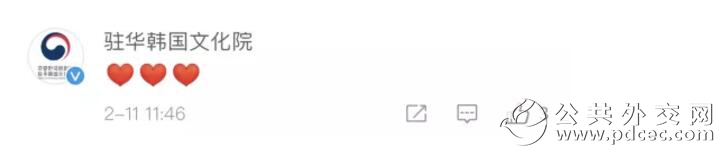 韩国驻华大使馆给中国加油鼓劲,驻华韩国文化院也为此点赞。