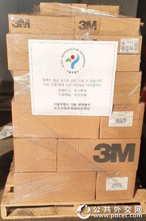 韩联社公开的首尔市捐赠物资的图片显示,这些物资上还贴上了用中文和韩语书写“兄弟同心,其力断金。守望相助,共克时艰”字样的贴纸。
