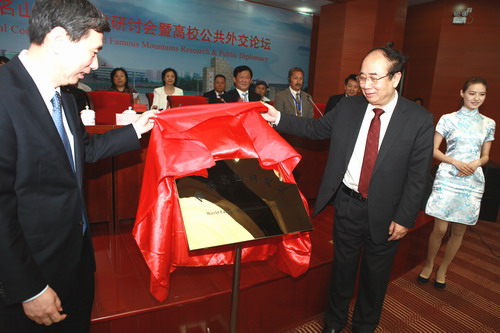 江西省政协主席黄跃金和前国务院新闻办主任、十一届全国政协外事委员会主任、现任中国人民大学新闻学院院长赵启正共同为“世界名山研究会”揭牌。
