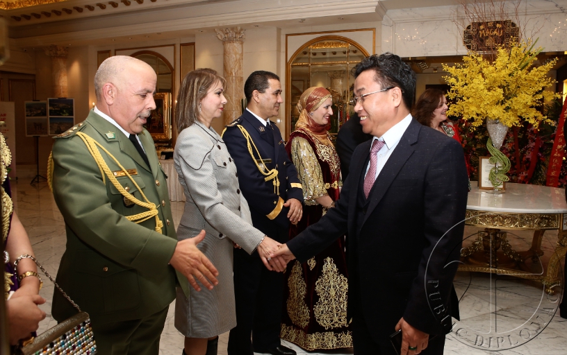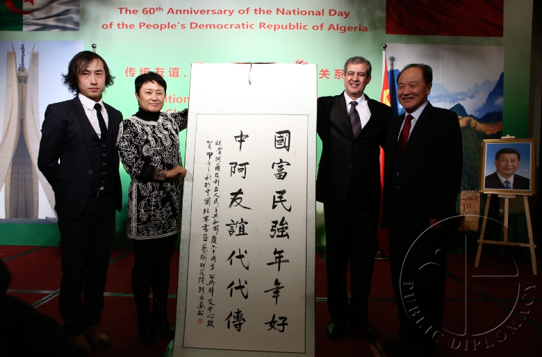 【公共外交网讯】10月31日晚,阿尔及利亚60周年国庆招待会在北京励骏酒店凡尔赛宴会厅隆重举行。阿尔及利亚驻华大使哈桑纳·拉贝希热情欢迎八方来宾。全国政协副主席齐续春、中国外交部副部长张明、驻华外交使节、中外媒体、企业代表等数百人出席。公共外交文化交流中心执行会长马振轩与副会长吴思科、曲真也应邀出席了招待会。