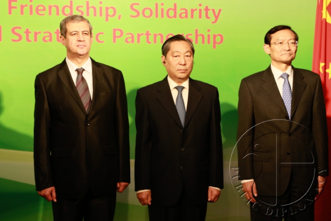 阿尔及利亚驻华大使哈桑纳·拉贝希(左)、全国政协副主席齐续春(中)、中国外交部副部长张明(右)