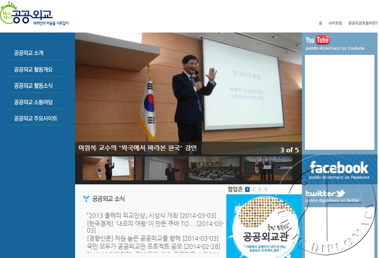 为了提高国民对公共外交的理解和宣传公共外交事业,韩国外交部3月3日起开设了公共外交网站。网站将对韩国外交机构的朝鲜半岛统一相关活动作出介绍。(www.publicdiplomacy.go.kr/index.jsp)