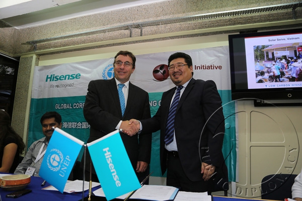 10月底,肯尼亚首都内罗毕,海信(Hisense)中东非销售区域总监朱聃和联合副秘书长环境署执行理事Achim Steiner微笑握手,续签合作协议,这是继2011年海信成为联合国“绿色创新奖”全球首家合作伙伴后,双方的“第二次握手”。