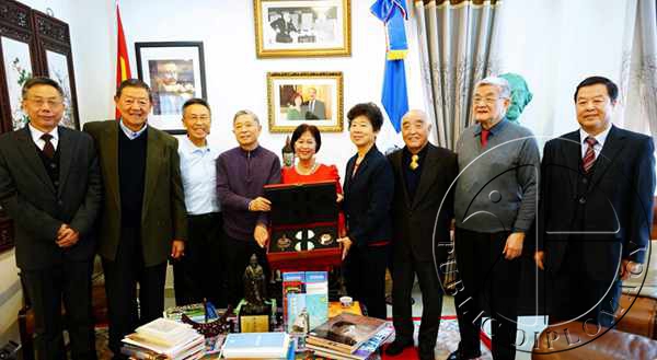 【公共外交网讯】2015年11月23日,应多尼米加共和国驻中国贸易发展办事处代表吴玫瑰女士邀请,中国原驻多米尼加贸易发展办事处代表、前驻玻利维亚大使李东、前驻墨西哥、阿根廷、哥伦比亚大使张沙鹰、前驻秘鲁大使麦国彦、前驻玻利维亚、乌拉圭大使汤铭新、前驻玻利维亚、巴哈马、哥伦比亚大使吴长胜、前驻厄瓜多尔、阿根廷、墨西哥大使曾钢、社科院名誉学部委员、拉美问题专家徐世澄、欧美同学会中国留学人员联谊会拉美分会副会长兼秘书长陈红娣等前外交官和拉美方向专家学者到多米尼加驻华代表处做客。