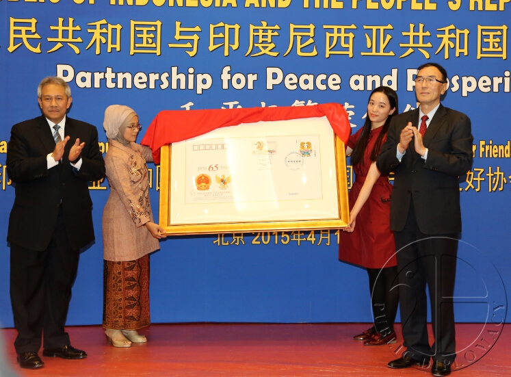 印尼驻华大使苏更·拉哈尔佐与中国全国人大常委会副委员长向巴平措一同为中印尼建交65周年“纪念封”揭幕