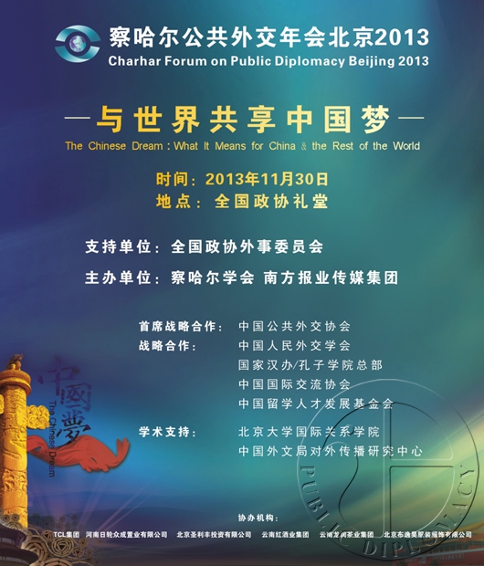 “察哈尔公共外交年会北京2013”的主题为“与世界共享中国梦”,将于11月30日在全国政协礼堂召开。