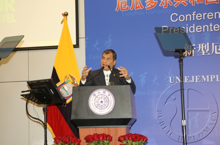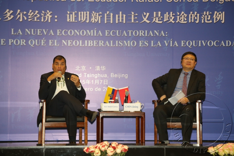 【公共外交网讯】应国家主席习近平邀请,厄瓜多尔总统拉斐尔·科雷亚·德尔加多于1月5日至9日对中国进行国事访问,并出席中国-拉共体论坛首届部长级会议。1月7日,科雷亚总统在清华大学发表题为“新型厄瓜多尔经济:证明新自由主义是歧途的典范”的演讲。演讲会由清华大学校长陈吉宁主持,厄瓜多尔驻中国大使何塞﹒博尔哈、外交部长里卡多·帕蒂尼奥、中外学者、企业界代表、清华大学在校师生等500余人与会,公共外交中心副会长曲真也应邀出席了此次演讲会。