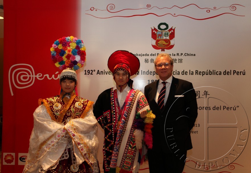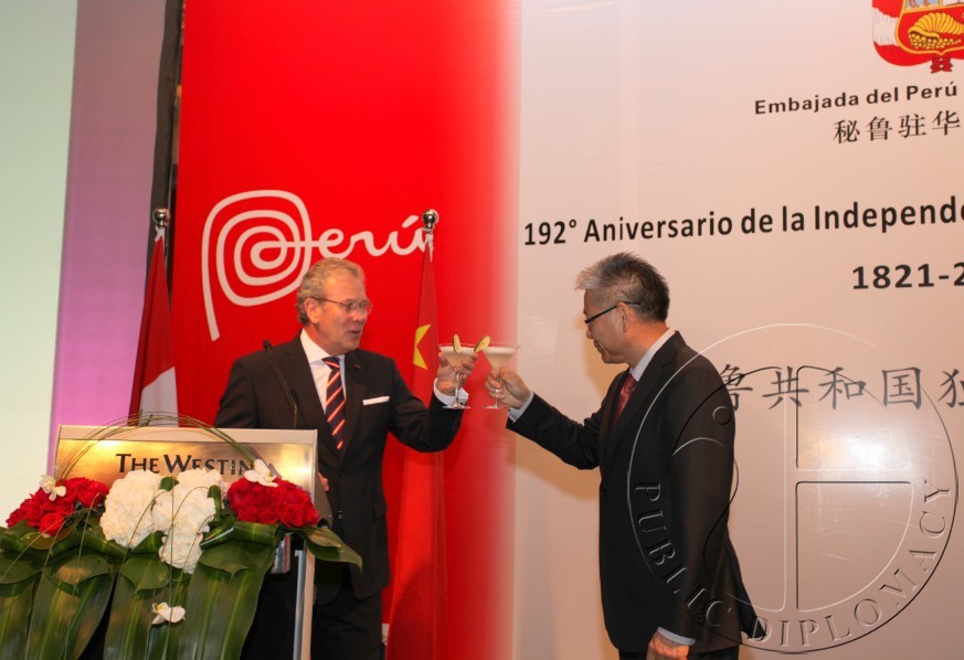 秘鲁国庆仪式在招待宴会进行到一半时开始。在相继奏完秘鲁共和国国歌与中华人民共和国国歌后,贡萨洛•古铁雷斯•雷内尔大使发表了简短的致辞,他表示,秘鲁与中国同为拥有千年文化传统遗产的国家,秘中两国双边关系经过近年来高层频繁的互访得到了进一步发展,各领域的合作不断加强,目前已提升为“全面战略合作伙伴关系”;而通过举办秘鲁美食节,希望将秘鲁美食带到神州大地,以向中国民众展示秘中两国间的文化关系。