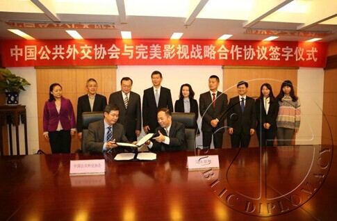 10月24日,北京完美影视公司与中国公共外交协会在北京签订战略合作协议,外交部部长助理刘建超和完美影视董事长池宇峰出席了签字仪式。