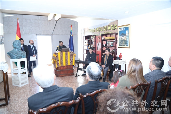 【公共外交网讯】2019年3月23日,玻利维亚海洋日纪念活动在北京玻利维亚驻华使馆举行。玻利维亚驻华大使埃里韦托·基斯佩、中国前驻玻利维亚和拉美加勒比地区使节、中玻友好人士、玻利维亚侨民参加活动。
