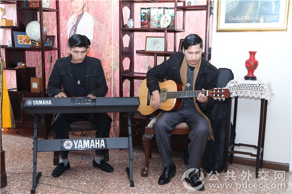 活动上,玻利维亚在华留学生弹奏演唱了富有民族特色的玻利维亚歌曲,悠扬婉转的歌声在透过太阳门背景的阳光下,透出高原雄鹰高远的意志和顽强的精神。