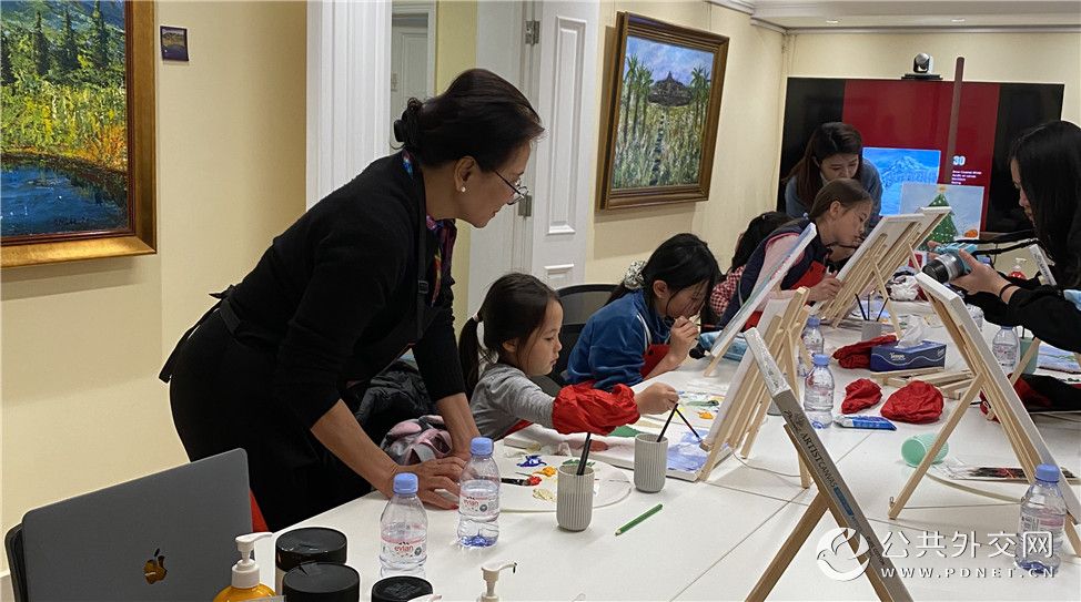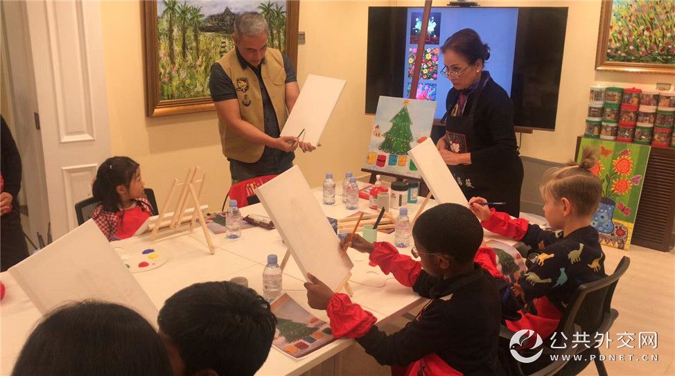 【公共外交网讯】2021年12月11日,DNB的绘画课堂活动在CNTY外交公寓办公室举办,来自乌克兰、印度、澳大利亚、巴巴多斯、加拿大等多国驻华外交官的子女及中国的小朋友参加活动,印尼画家、印尼驻华大使夫人艾茜薇女士教授并同小朋友一起绘画油画作品。