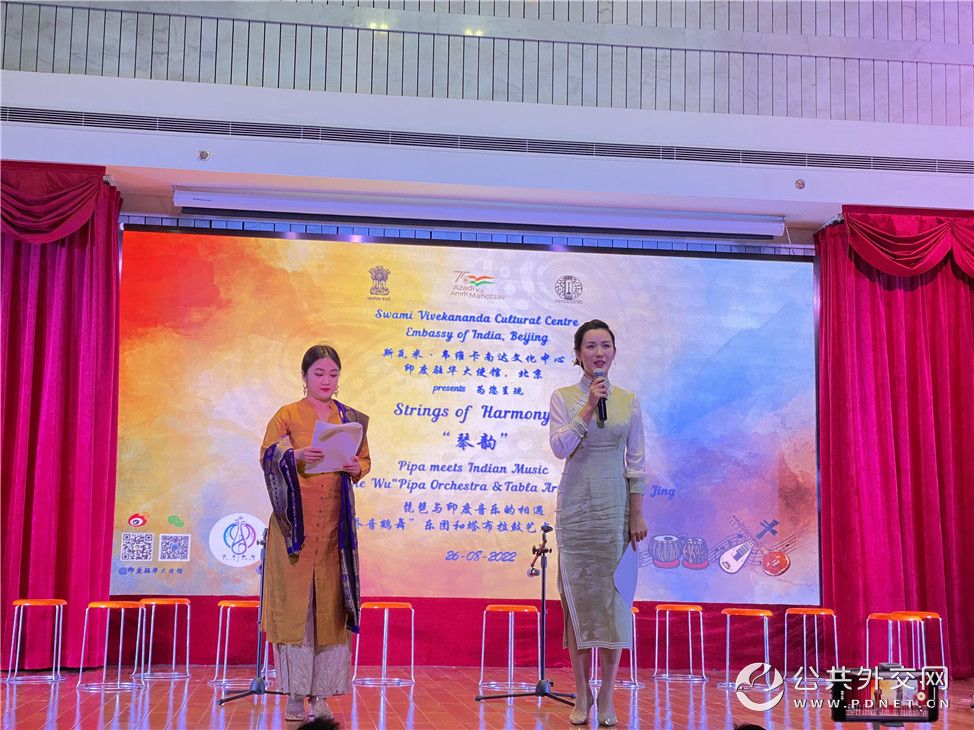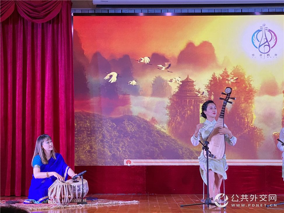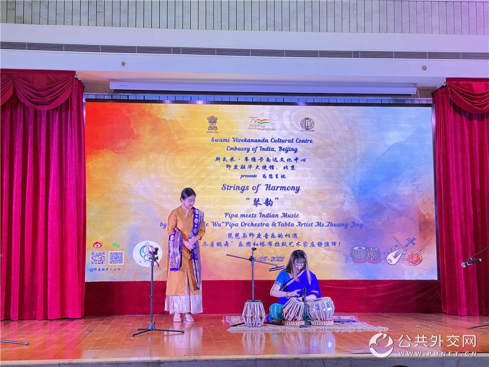 【公共外交网讯】2022年8月26日,“琴韵”演奏会在印度驻华使馆斯瓦米·韦维卡南达文化中心举办,“乔音鹤舞”乐团团长乔鹤带领中国琵琶乐手与印度传统打击器乐塔布拉鼓演奏家庄静共同带来了一场融合中国印度音乐元素的精彩音乐会。