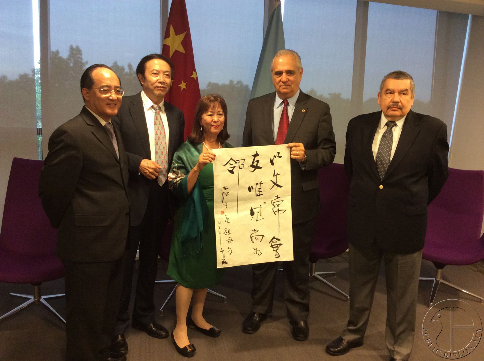 (左起)中国驻巴拿马代表王卫华、袁熙坤、多米尼加驻中国代表吴玫瑰、拉美议会办公室主任冈萨雷斯等人在拉美议会大厦
